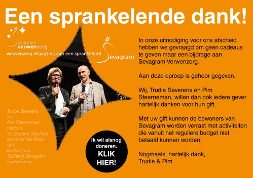 Inmiddels is Verwenzorg een vaste waarde binnen Sevagram, waar fondsen en financiële middelen voor worden geworven. Sevagram Verwenzorg is een ANBI stichting en werkt zonder winstoogmerk.