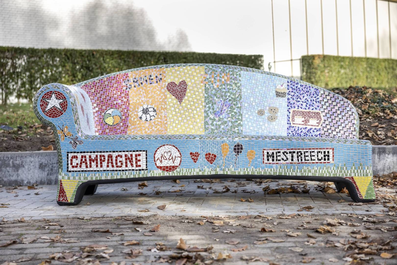 Afgezien van dat er de afgelopen maanden hard is gewerkt, gingen de wekelijkse activiteiten in zorgcentrum Campagne gewoon door, zoals kienen of kaarten. Samen werden honderden mozaïeksteentjes op de betonnen bank geplakt. En het resultaat mag er zijn: een nieuwe ontmoetingsplek voor jong en oud in de wijk Campagne in Maastricht.